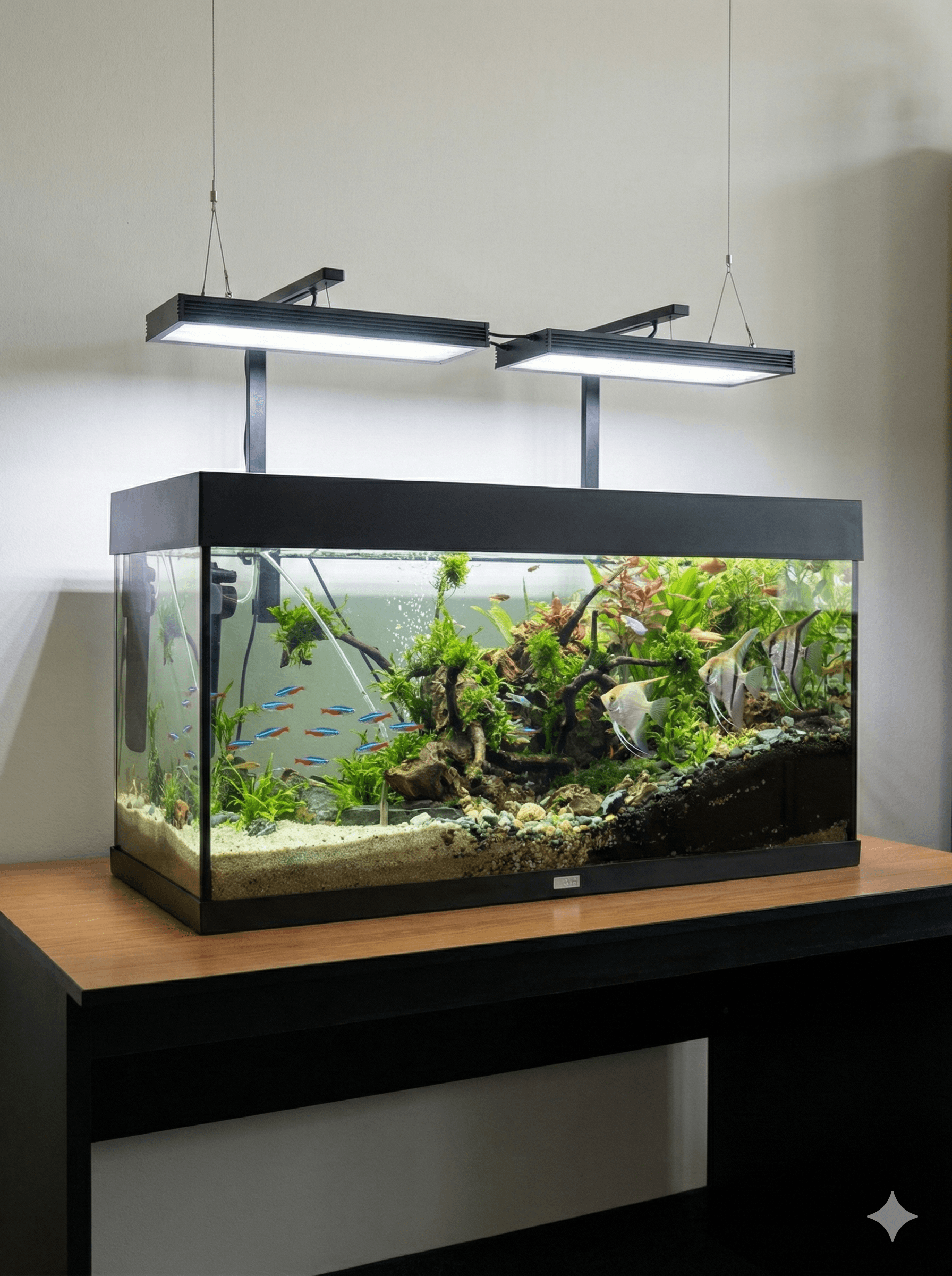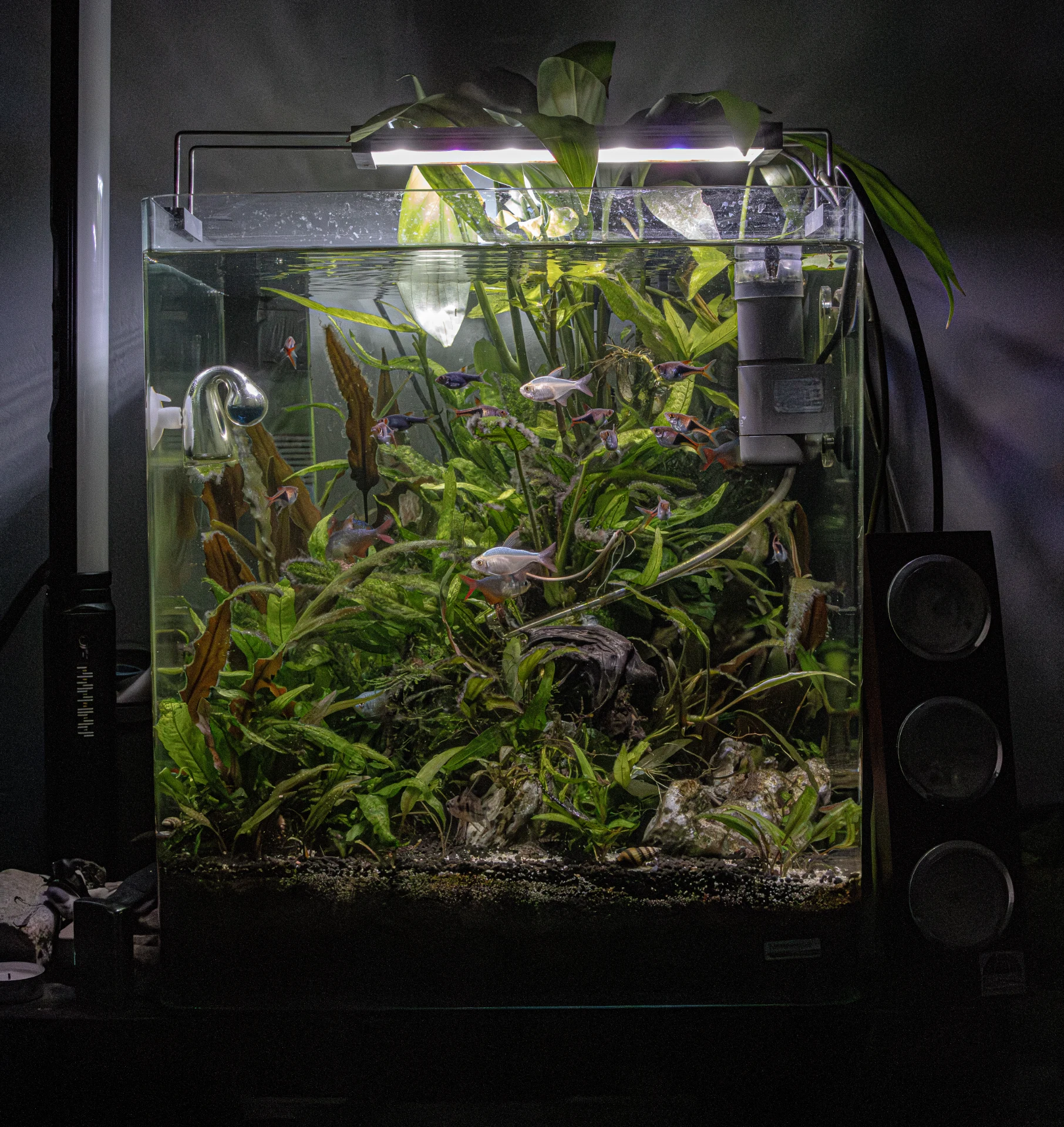 Naše první renovační zakázka. Akvárium jsme kompletně rozebrali, vyčistili filtry a osadili nové kořeny i rostliny. Ryby jsme vrátili zpět do čistého, vyváženého prostředí.